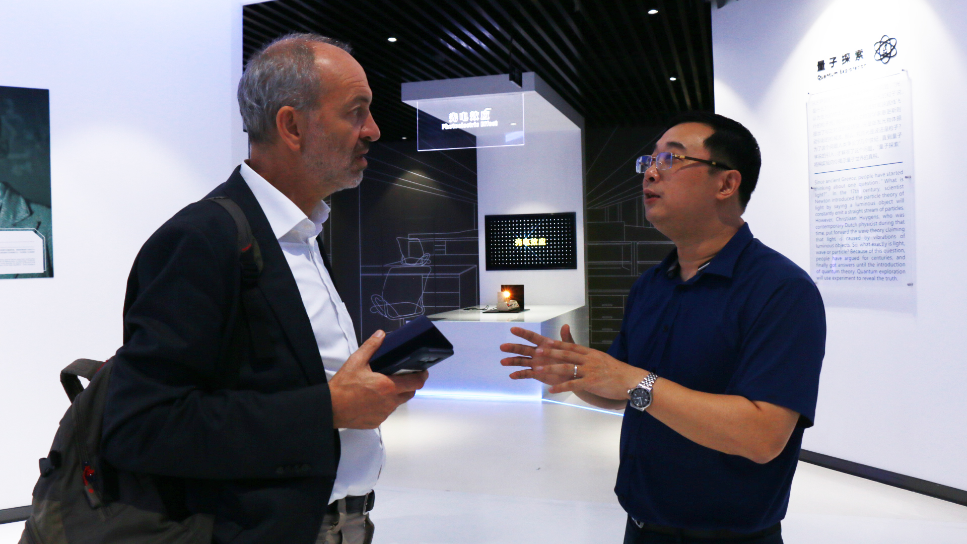 此前一天,Reinhard Scholl博士还特别参观了英国威廉希尔产业园区的科技展示厅。在副总裁黄翔的陪同介绍下,Reinhard Scholl博士相继观看了量子擦除、光电效应等量子科学实验展示,以及攻防实验WiFi漏洞破解和经典窃听演示,还详细了解了世界各国对量子通信产业的布局以及我国目前的产业发展现状。