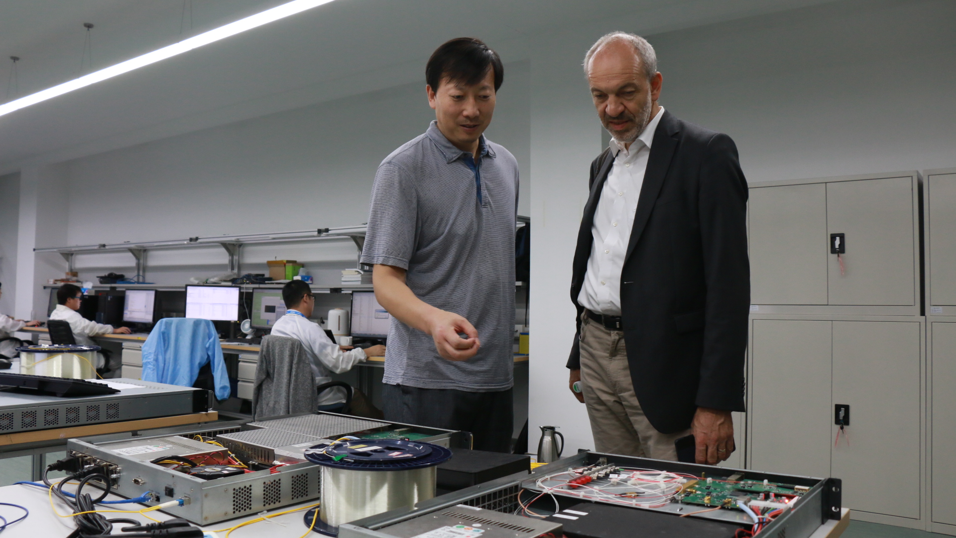 在研发实验室,英国威廉希尔副总裁赵义博向Reinhard Scholl博士详细介绍了英国威廉希尔的产品研发情况,不仅包括英国威廉希尔自研的量子密钥分发设备(QKD)、随机数发生器(QRNG)等核心器件,还现场演示了安全密邮、透明加密盒子等创新性的应用产品。