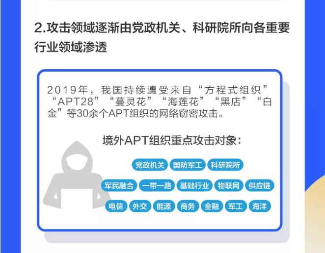 报告综述:2019 年,在我国相关部门持续开展的网络安全威胁治理下,分布式拒绝服务攻击(以下简称 DDoS 攻击)、高级持续性威胁攻击(以下简称 APT 攻击)、漏洞威胁、数据安全隐患、移动互联网恶意程序、网络黑灰色产业链(以下简称黑灰产)、工业控制系统安全威胁总体下降,但呈现出许多新的特点,带来新的风险与挑战。