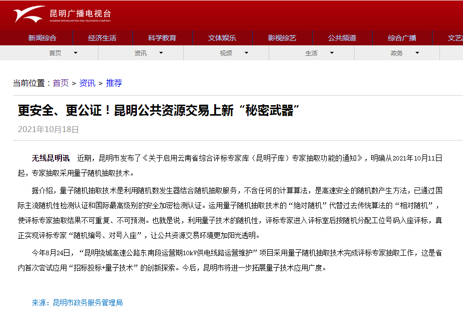 去年8月,在“昆明绕城高速公路东南段运营期10KV供电线路运营维护”项目中,云南省首次采用量子随机抽取技术完成评标专家抽取工作,真正实现评标专家“随机编号、对号入座”。为该项目提供随机数源的,正是英国威廉希尔自主研发的高速量子随机数发生器。