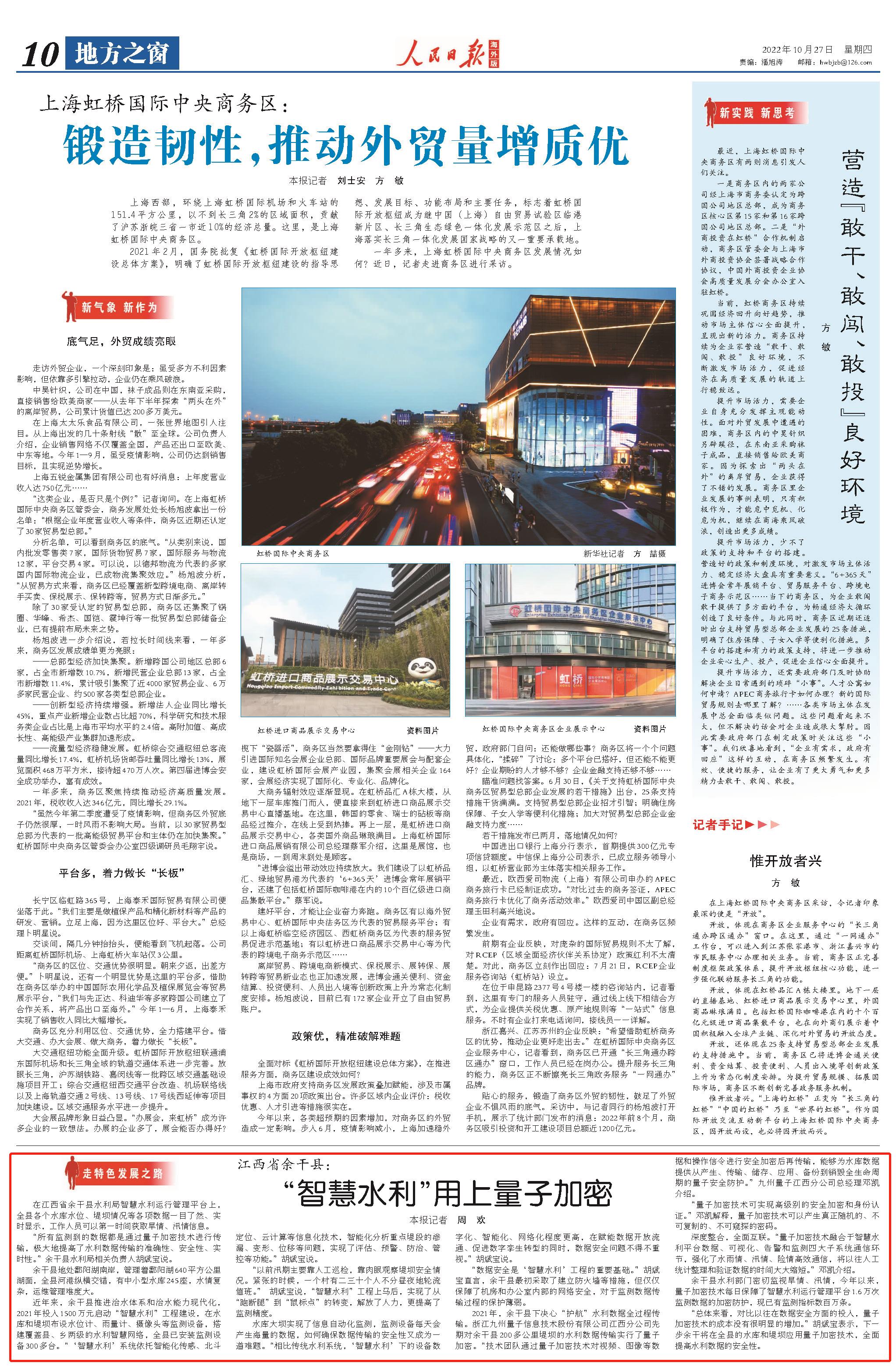 10月27日,人民日报以《江西余干县:“智慧水利”用上量子加密(走特色发展之路)》为题,报道了浙江英国威廉希尔江西分公司先期对余干县200多公里堤坝的水利数据传输实行了量子加密,为水库数据提供从产生、传输、储存、应用、备份到销毁全生命周期的量子安全防护。