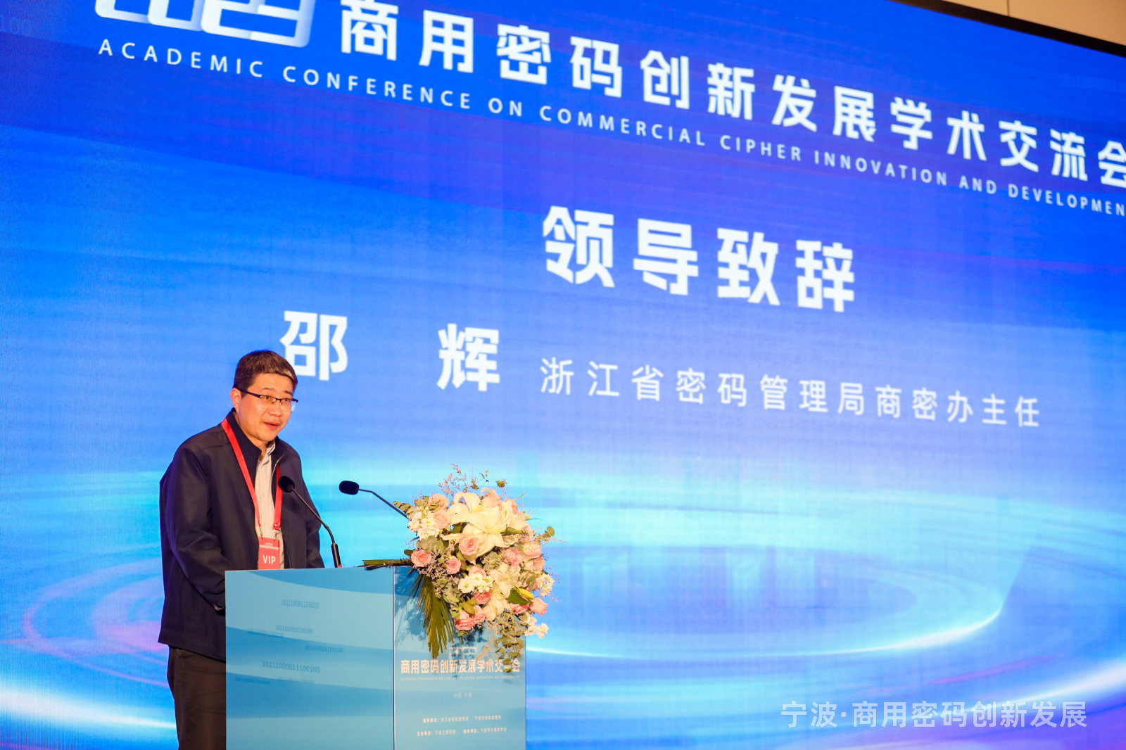 图为浙江省密码管理局商用密码管理办公室主任邵辉正在为大会致辞