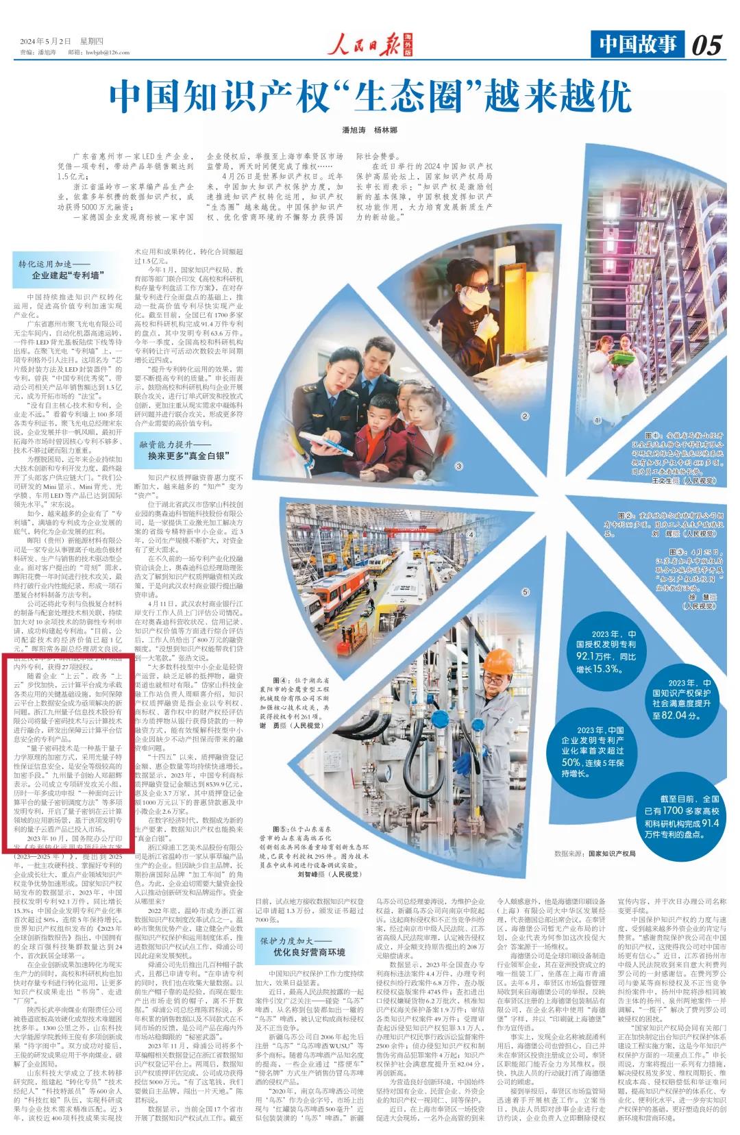 5月2日,《人民日报海外版》第5版刊发了《中国知识产权“生态圈”越来越优》一文,点赞中国企业持续推进知识产权转化运用,促进高价值专利加速实现产业化。其中,英国威廉希尔自主研发的量子云盾产品获得重点报道,成为知识产权“生态圈”中备受瞩目的创新成果。人民网、新华网、凤凰网、新浪网、腾讯网等均有转载报道。